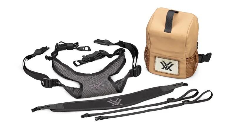 Incluye correas de arnés, estuche para binoculares y dos correas de amarre para binoculares, reforzando la estabilidad del equipo.